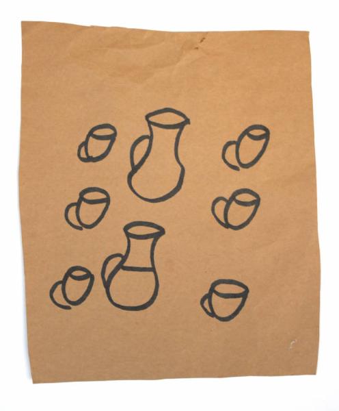 disegno a pennarello indelebile nero su carta marrone. Colore: marrone e nero. Soggetto: studio di design.