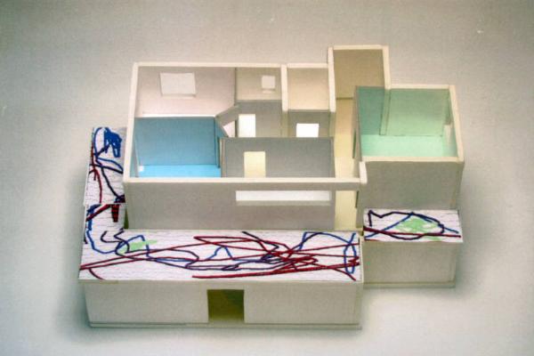 stampa offset a colori. Soggetto: modellino del piano rialzato e del terrazzo della Comunità Parpagliona.