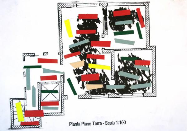 disegno a tecnica mista: pennarello e collage con cartoncini colorati su fotocopia. Colore: bianco, nero, rosso, verde scuro, giallo, beige, celeste. Soggetto: progetto di pavimento. Scritta in basso e al centro: "pianta piano terra - scala 1:100". Disegno firmato e datato: Nico, 19/03/02.