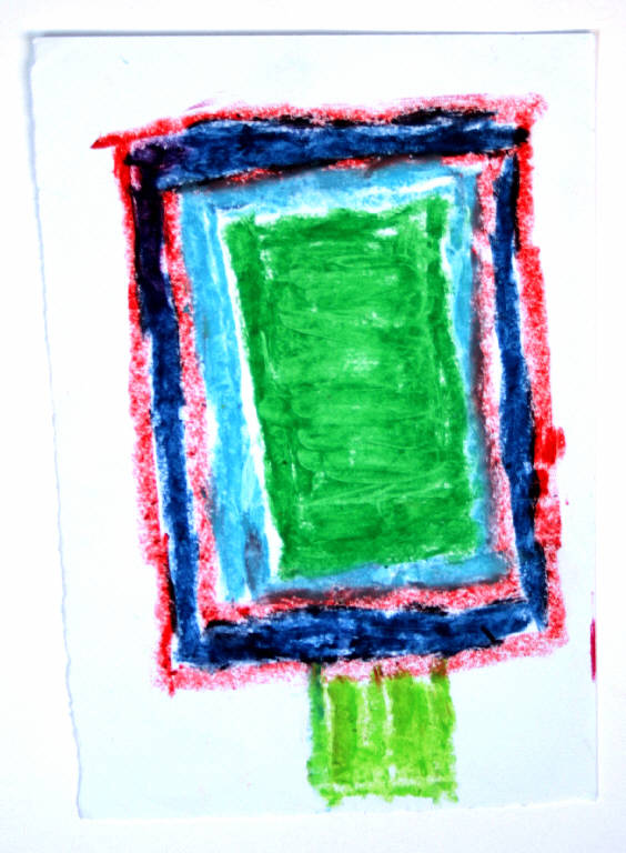 disegno a pastelli a olio su carta. Colore: bianco, verde scuro e chiaro, rosso, celeste e blu. Soggetto: bozzetto decorativo eseguito su carta strappata.
