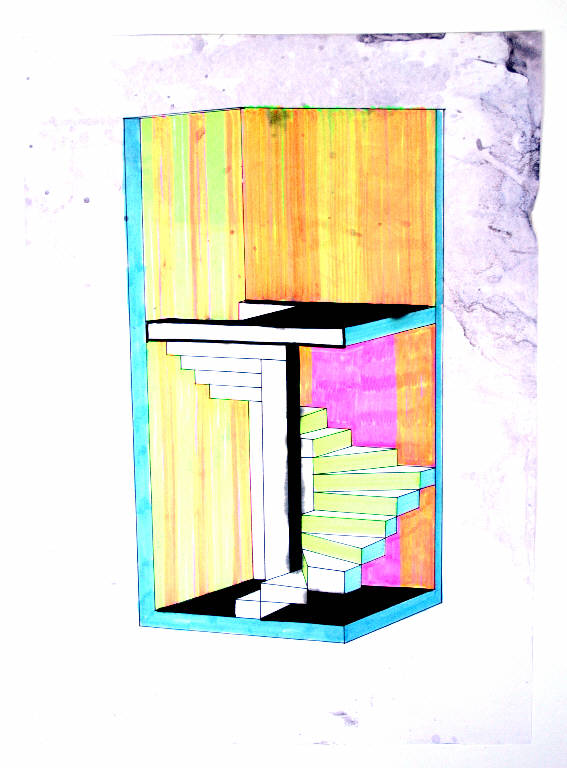 disegno a pennarelli ed evidenziatori su fotocopia. Colore: arancio, giallo acido, verde, rosa scuro, celeste, nero e bianco. Soggetto: v. 22 scale.