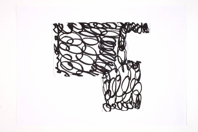 pennarello su carta da pacco bianca, ritagliata. Colore: nero. Soggetto: progetto di pavimento. Disegno firmato e datato sul verso: Angela, 19/02/02.