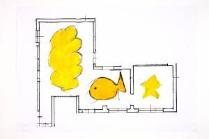 tecnica mista: fusaggine, colla, cartoncino e acrilico su fotocopia di carta bianca. Colore: nero, giallo ocra. Soggetto: progetto di pavimento.