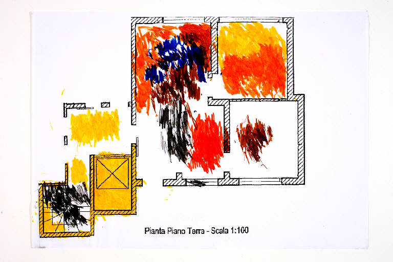pennarello su fotocopia di carta bianca. Colore: nero, arancio scuro, arancio chiaro, blu, marrone. Soggetto: progetto di pavimento. Scritta: "pianta piano terra - scala 1:100". Disegno firmato e datato sul verso : "Nicola, 26/03/02".