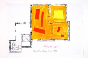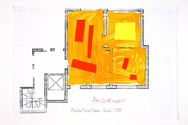 tecnica mista e collage: cartoncino e acrilico su fotocopia di carta bianca. Colore: nero, arancio, fucsia scuro fosforescente, giallo limone fosforescente. Soggetto: progetto di pavimento. Scritta: "pianta piano terra - scala 1:100". Disegno firmato sul recto con pennarello rosa: "Angela" e datato sul verso: "04/03/02".