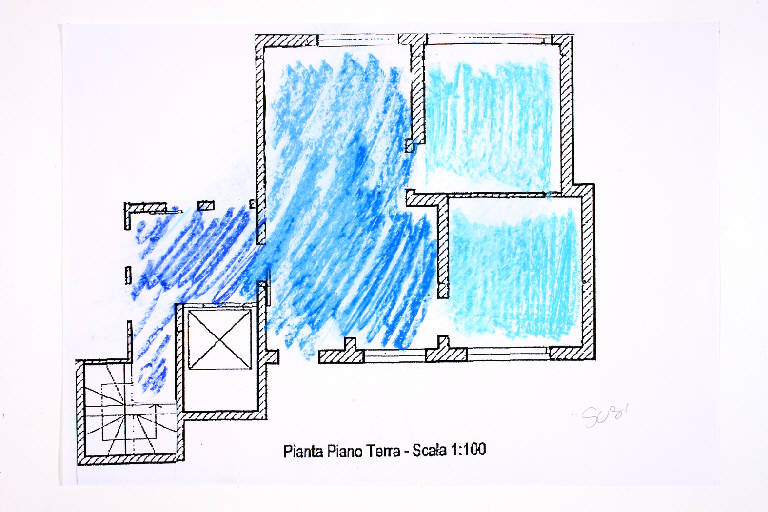pastello a cera su fotocopia di carta bianca. Colore: nero, blu oltremare, turchese, celeste. Soggetto: progetto di pavimento. Scritta: "pianta piano terra - scala 1:100". Disegno firmato sul recto a matita: "Susi".