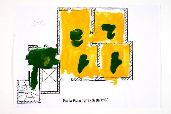 acrilico su fotocopia di carta bianca. Colore: nero, verde scuro, arancio. Soggetto: progetto di pavimento. Scritta: "pianta piano terra - scala 1:100". Disegno firmato sul recto a matita: "Susi".