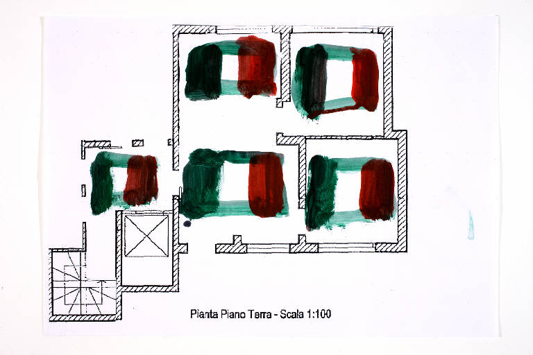 acrilico acquerellato su fotocopia di carta bianca. Colore: nero, rosso scuro, verde scuro. Soggetto: progetto di pavimento. Scritta: "pianta piano terra - scala 1:100".