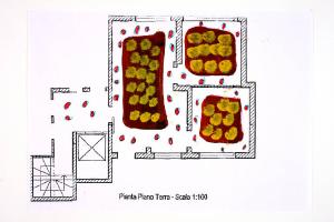 tecnica mista su fotocopia di carta bianca: acrilico e pennarelli. Colore: nero, rosso, rosso scuro, verde smeraldo, giallo ocra. Soggetto: progetto di pavimento. Scritta: "pianta piano terra - scala 1:100".
