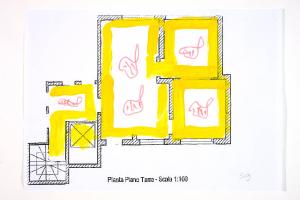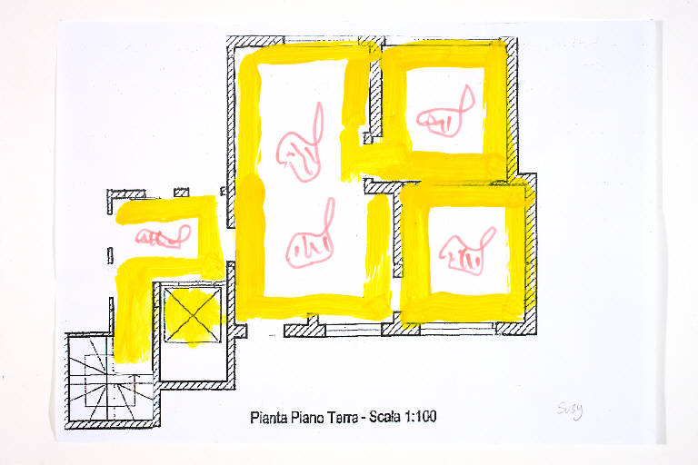 tecnica mista: acrilico e pennarello su fotocopia di carta bianca. Colore: nero, rosa, giallo scuro. Soggetto: progetto di pavimento. Scritta: "pianta piano terra - scala 1:100". Disegno firmato sul recto a matita: "Susy".