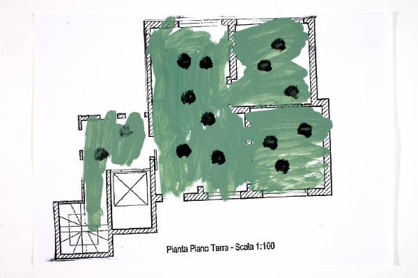 acrilico su fotocopia di carta bianca. Colore: nero, verde oliva. Soggetto: progetto di pavimento. Scritta: "pianta piano terra - scala 1:100".