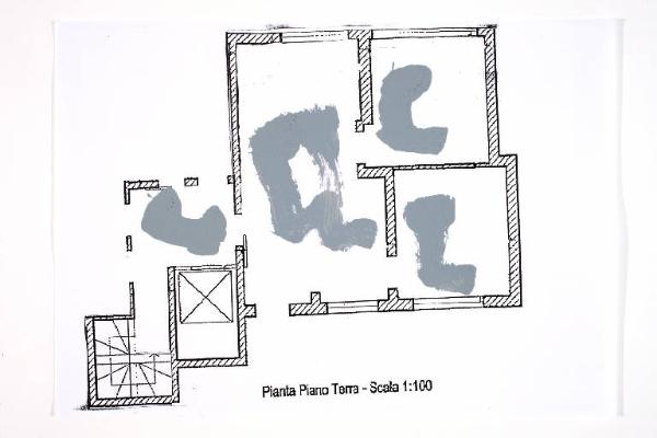 acrilico su fotocopia di carta bianca. Colore: nero, grigio. Soggetto: progetto di pavimento. Scritta: "pianta piano terra - scala 1:100".