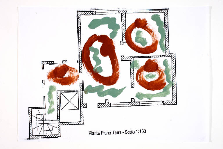 acrilico su fotocopia di carta bianca. Colore: nero, marrone, verde oliva. Soggetto: progetto di pavimento. Scritta: "pianta piano terra - scala 1:100".