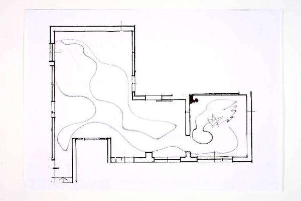 tecnica mista: pennarello e penna biro su fotocopia di carta bianca con taglio. Colore: nero. Soggetto: progetto di pavimento. Disegno firmato e datato sul verso: "Angela 18/02/02".