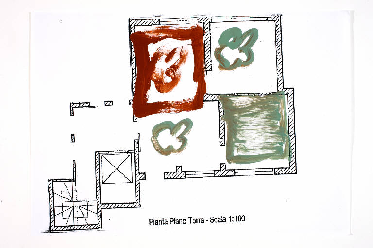 acrilico su fotocopia di carta bianca. Colore: nero, verde oliva, terra di Siena scura. Soggetto: progetto di pavimento. Scritta: "pianta piano terra - scala 1:100".