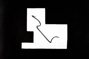 pennarello su carta da pacco avorio chiaro ritagliata. Colore: nero. Soggetto: progetto di pavimento. Disegno firmato e datato sul verso: "Angela, 19/02/02".