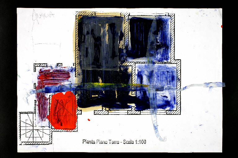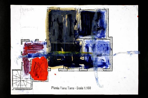 tecnica mista e collage: plastica, olio, acrilico, matita, colla vinilica su fotocopia di carta bianca. Colore: nero, blu di Prussia, blu, rosso, giallo, viola scuro. Soggetto: progetto di pavimento. Scritta: "pianta piano terra - scala 1:100". Disegno firmato sul recto a matita: "Angela".