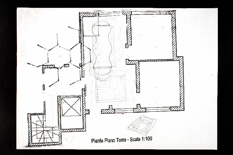 tecnica mista: matita e pennarello, sul recto e verso del foglio, su fotocopia di carta bianca. Colore: nero, grigio. Soggetto: progetto di pavimento. Scritta sul verso: "pianta piano terra - scala 1:100". Sul disegno sono presenti annotazioni relative al progetto.