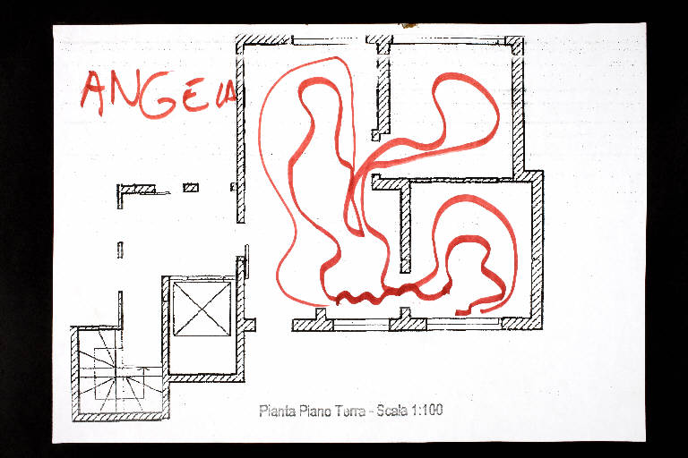 pennarello su fotocopia di carta bianca. Colore: nero, bordeaux. Soggetto: progetto di pavimento. Scritta: "pianta piano terra - scala 1:100". Disegno firmato sul verso con pennarello rosso: "Angela".