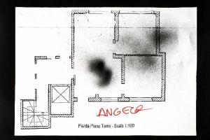 vernice spray su fotocopia di carta bianca. Colore: nero, grigio. Soggetto: progetto di pavimento. Scritta: "pianta piano terra - scala 1:100". Disegno firmato sul recto con pennarello bordeaux: "Angela".