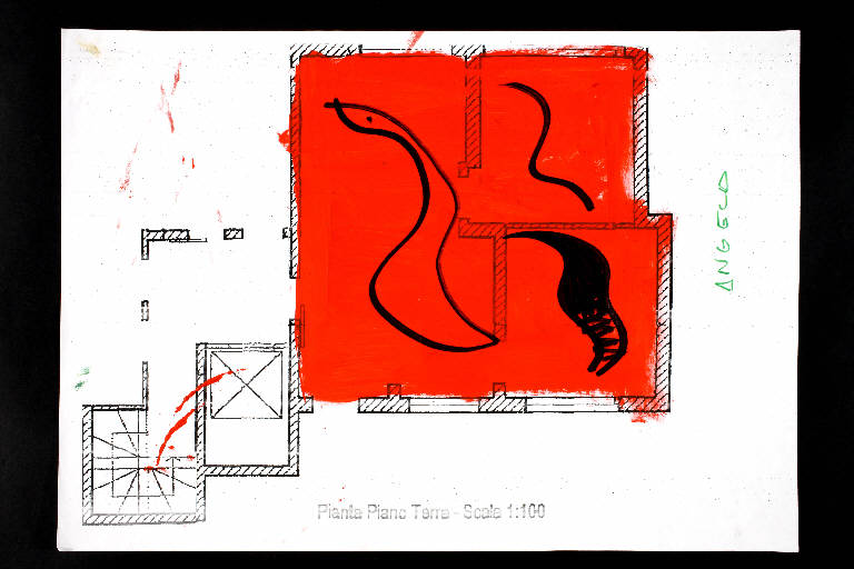 tecnica mista: acrilico e pennarello su fotocopia di carta bianca. Colore: nero, rosso. Soggetto: progetto di pavimento. Scritta: "pianta piano terra - scala 1:100". Disegno firmato sul recto con pennarello verde chiaro: "Angela", e datato sul verso: "04/03/02".