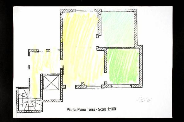 pastello a cera su fotocopia di carta bianca. Colore: nero, giallo, verde pisello, verde chiaro. Soggetto: progetto di pavimento. Scritta: "pianta piano terra - scala 1:100". Disegno firmato sul recto a matita: "Susi".