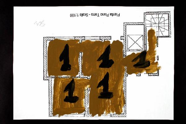 acrilico su fotocopia di carta bianca. Colore: nero, ocra gialla. Soggetto: progetto di pavimento. Scritta: "pianta piano terra - scala 1:100". Disegno firmato sul recto a matita: "Susi".