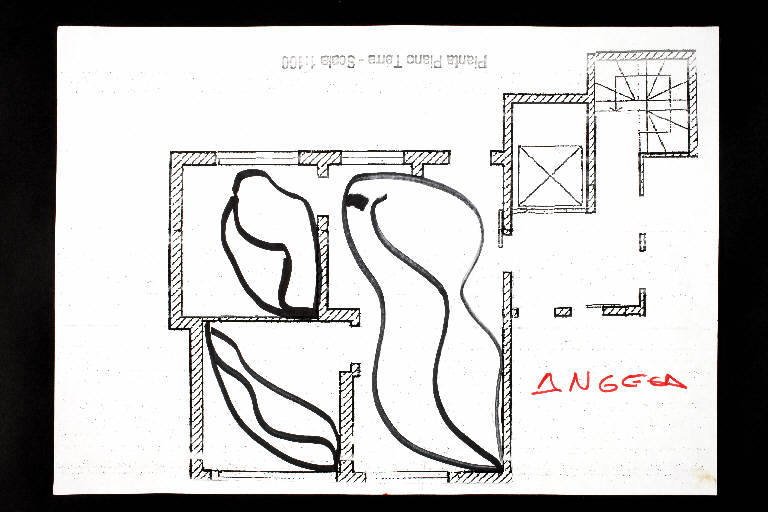 pennarello su fotocopia di carta bianca. Colore: nero, grigio. Soggetto: progetto di pavimento. Scritta: "pianta piano terra - scala 1:100". Disegno firmato sul recto con pennarello bordeaux: "Angela" e datato sul verso: "04/03/02".
