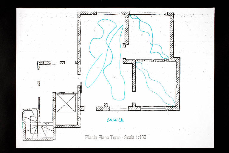 pennarello su fotocopia di carta bianca. Colore: nero, verde smeraldo. Soggetto: progetto di pavimento. Scritta: "pianta piano terra - scala 1:100". Disegno firmato sul recto con pennarello verde smeraldo: "Angela" e datato sul verso: "05/03/02".