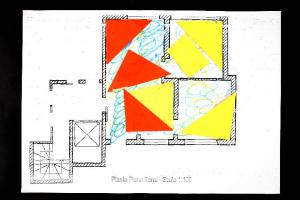 tecnica mista e collage: cartoncino colorato, acrilico fosforescente, pastello a cera, colla vinilica su fotocopia di carta bianca. Colore: nero, giallo fosforescente, giallo ocra, rosso fosforescente, azzurro. Soggetto: progetto di pavimento. Scritta: "pianta piano terra - scala 1:100". Disegno datato sul verso: "04/03/02".