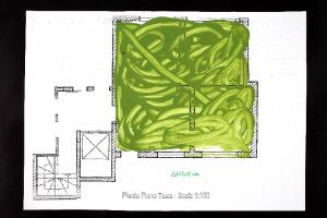 acrilico su fotocopia di carta bianca. Colore: nero, verde marcio chiaro. Soggetto: progetto di pavimento. Scritta: "pianta piano terra - scala 1:100". Disegno firmato sul recto con pennarello verde: "Angela".