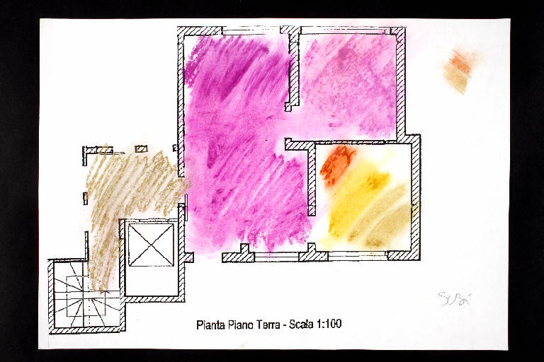 pastello a olio su fotocopia di carta bianca. Colore: nero, terra di Siena bruciata, ocra chiara e scura, viola, bronzo. Soggetto: progetto di pavimento. Scritta: "pianta piano terra - scala 1:100". Disegno firmato sul recto a matita: "Susi".