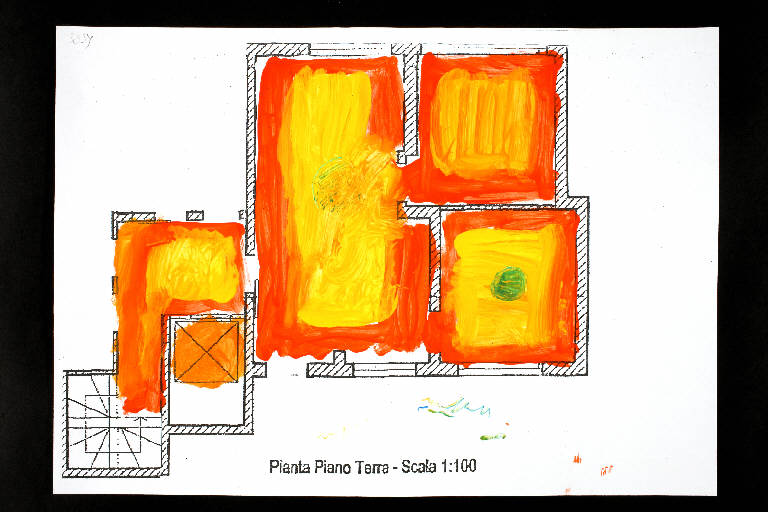 tecnica mista: acrilico e pennarello su fotocopia di carta bianca. Colore: nero, rosso, giallo, arancio, verde, azzurro. Soggetto: progetto di pavimento. Scritta: "pianta piano terra - scala 1:100". Disegno firmato sul recto a matita: "Susy".