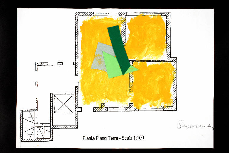 tecnica mista e collage: cartoncino colorato, acrilico e colla vinilica su fotocopia di carta bianca. Colore: nero, arancio, verde scuro, verde chiaro, grigio. Soggetto: progetto di pavimento. Scritta: "pianta piano terra - scala 1:100". Disegno firmato sul recto a matita: "Susanna".