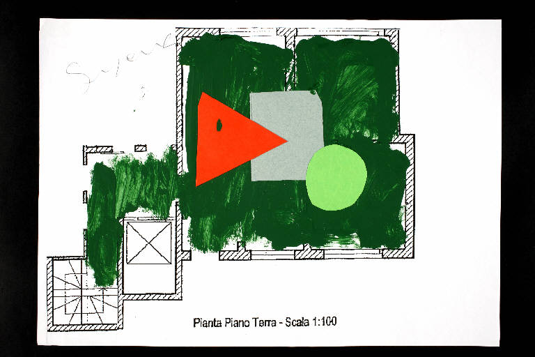 tecnica mista e collage: cartoncino colorato, acrilico e colla vinilica su fotocopia di carta bianca. Colore: nero, verde scuro, verde chiaro, grigio, rosso. Soggetto: progetto di pavimento. Scritta: "pianta piano terra - scala 1:100". Disegno firmato sul recto a matita: "Susanna".