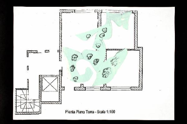 tecnica mista e collage: carta da pacco, acrilico e fusaggine su fotocopia di carta bianca. Colore: nero, verde bianco, grigio. Soggetto: progetto di pavimento. Scritta: "pianta piano terra - scala 1:100".