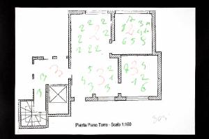pennarello su fotocopia di carta bianca. Colore: nero, rosa, verde chiaro. Soggetto: progetto di pavimento. Scritta: "pianta piano terra - scala 1:100". Disegno firmato sul recto a matita: "Susi".