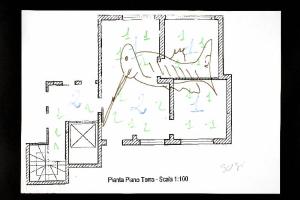 pennarello su fotocopia di carta bianca. Colore: nero, blu, marrone chiaro, verde chiaro. Soggetto: progetto di pavimento. Scritta: "pianta piano terra - scala 1:100". Disegno firmato sul recto a matita: "Susi".