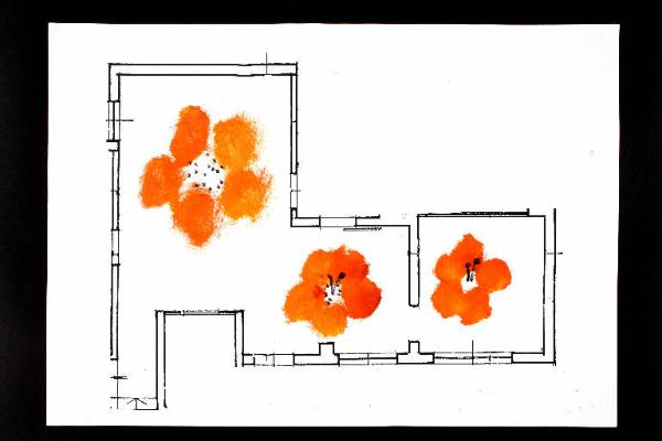 tecnica mista: acrilico e pennarello su fotocopia di carta bianca. Colore: nero, arancio chiaro, arancio scuro, grigio, rosso. Soggetto: progetto di pavimento.