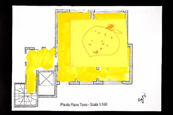 tecnica mista e collage: cartoncino colorato, acrilico e pennarello su fotocopia di carta bianca. Colore: nero, arancio chiaro, giallo scuro, rosa. Soggetto: progetto di pavimento. Scritta: "pianta piano terra - scala 1:100". Disegno firmato sul recto con pennarello nero: "Susi".