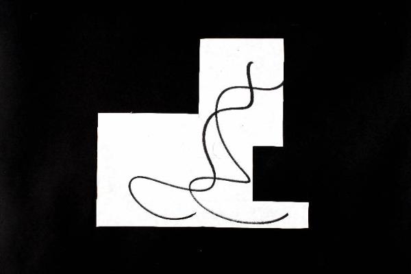 pennarello su carta da pacco bianca, ritagliata. Colore: nero. Soggetto: progetto di pavimento. Disegno firmato e datato sul verso: "Angela, 19.02.02".