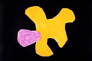 tecnica mista: pastello a cera e acrilico su carta da pacco bianca, ritagliata. Colore: arancio chiaro, arancio scuro, viola. Soggetto: studio/bozzetto per tappeto. Disegno firmato sul verso: "Angela".