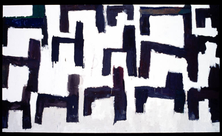 tecnica mista su lenzuolo: pittura a olio, acrilico e smalto. Colore: bianco, beige, verde scuro, marrone, ocra scura, nero. Soggetto: sedie.