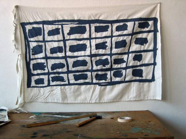 tessuto di cotone cucito a macchina. Colore: avorio, blu scuro. L'opera, che fa parte di una scultura composta da nove bandiere con un piedistallo comune, è stata smembrata dagli autori e le bandiere vendute come opere singole.