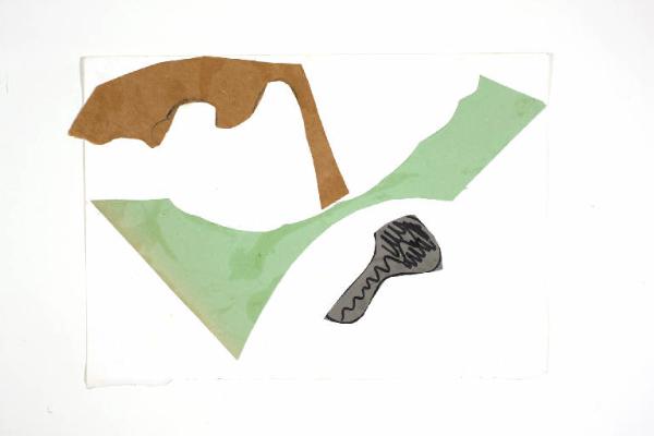 collage con cartoncino colorato, colla vinilica, pennarello, pastello a cera su cartoncino bianco. Colore: marrone chiaro, verde oliva chiaro, grigio, blu oltremare, nero. Soggetto: elemento decorativo.