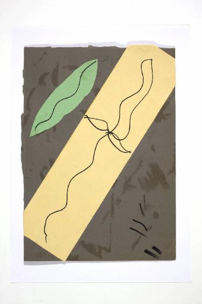 collage di cartoncino colorato, pennarello e colla vinilica. Colore: terra di Siena naturale chiara, verde oliva chiaro, nero, grigio scuro e medio. Soggetto: elemento decorativo.