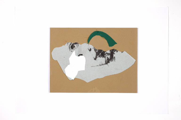 collage di cartoncino colorato, carta, e colla vinilica. Colore: verde scuro, bianco, grigio chiaro e scuro, nero, marrone chiaro. Soggetto: elemento decorativo.