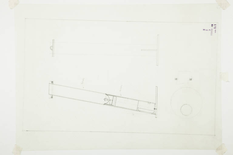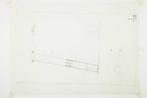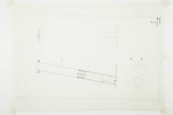Disegno a matita su carta da lucido di pianta e due sezioni della lampada da tavolo Gibigiana.