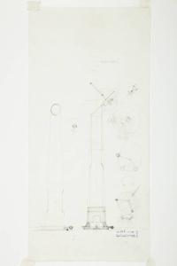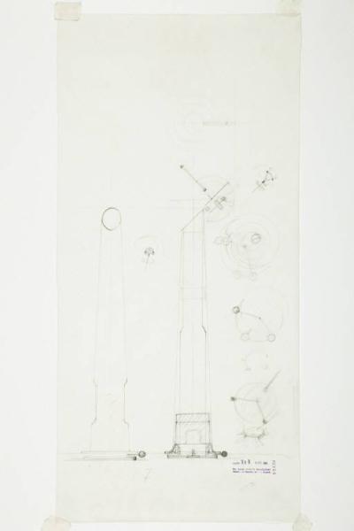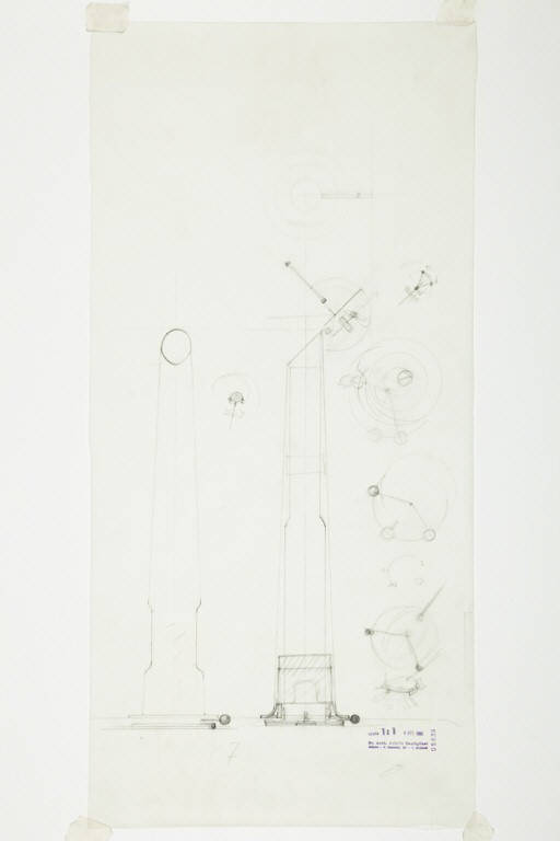 Disegno in matita su carta da lucido della pianta, prospetto e sezione della lampada da tavolo Gibigiana ancora in fase di progetto.