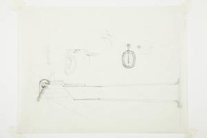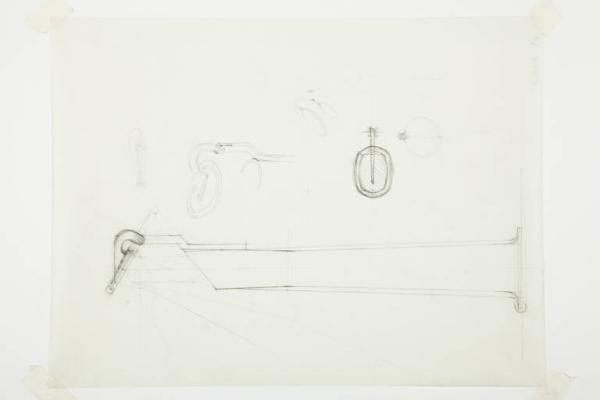 Disegno a matita su carta da lucido di prospetto e particolari del coperchio a specchio della lampada Gibigiana.